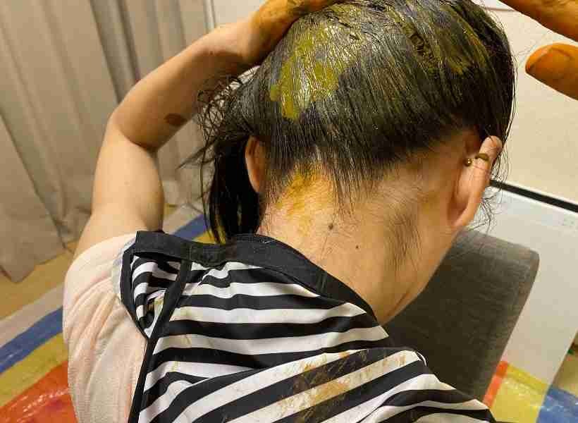 片手で髪を持ち上げたら、もう一方の手で頭皮や髪の根本にヘナを塗ります。